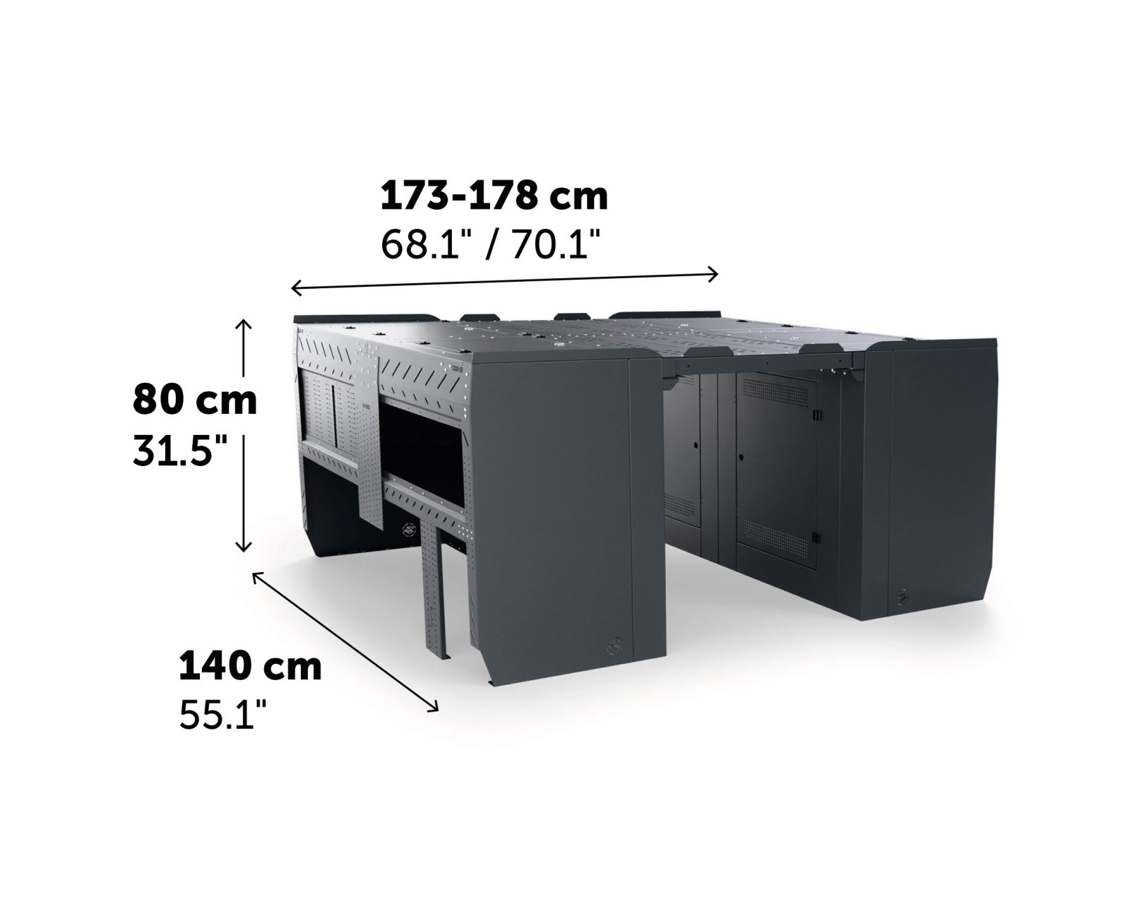 The shelf is permanently riveted to the structure and additionally stabilized by an adjustable support that you can mount anywhere along the rear section of the bed. This ensures maximum rigidity and safety - even under heavy loads.