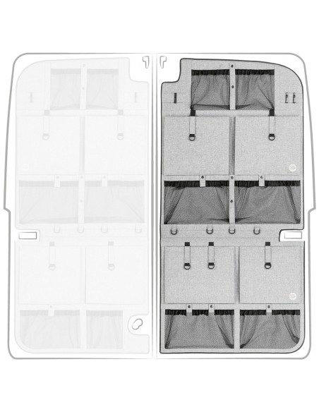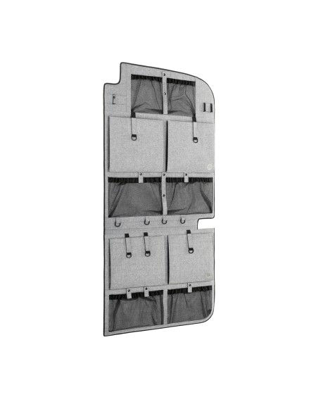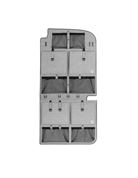 The Moon Organiser was created to make maximum use of the space in your van. Mounted on the rear door, it provides access to handy tools. A multitude of pockets, nets, hooks and elastics ensure that everything is always close at hand (and in its place). A set of organisers will allow you to carry more than 60 litres of luggage without losing any space inside the car.