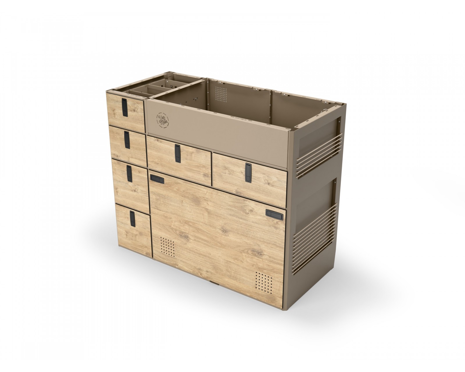 Moon Kitchen Solid is ultimately several kitchen models for installation in the aisle, facing the entrance, or positioned with the back to the cabin. All models will be aluminum, riveted, with exceptional durability. Most models are easy to install and disassemble, transfer between vehicles if needed.