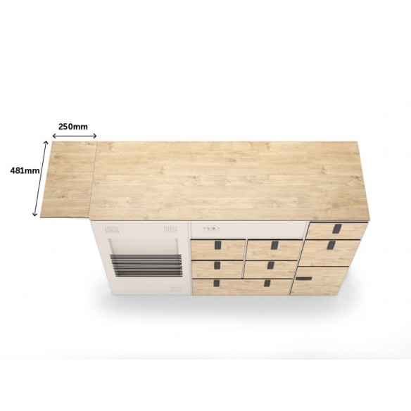 Każdy blat ze zlewem zawiera prostokątną stalową miskę (wymiary zewnętrzne 320 × 260 mm, głębokość 150 mm) z systemem odpływowym PVC (kolanko 90°, Ø 25 mm) i sitkiem ze stali nierdzewnej (Ø 70 mm). Odpływ dodaje 30 mm do całkowitej głębokości. Dopasowana zatyczka HPL zamienia zlew w dodatkową powierzchnię roboczą podczas przygotowywania posiłków, zapewniając elastyczność w kompaktowej przestrzeni. Zarówno zlew, jak i zatyczka są zaprojektowane, aby służyć tak długo jak Twoja kuchnia.