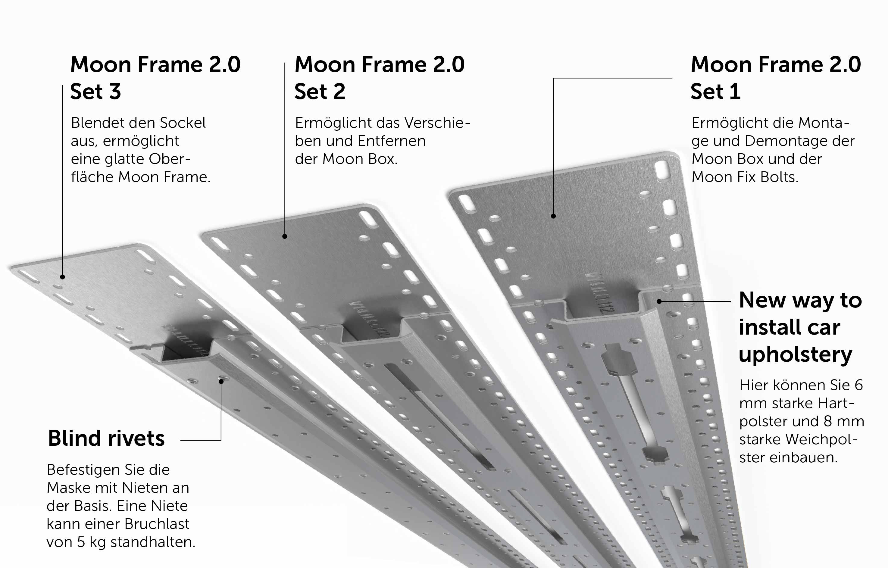 Sorgt für eine ästhetische Abdeckung der Öffnungen und erhält gleichzeitig die Möglichkeit zum Verschieben, Montieren und Demontieren der Moon Boxen. Perfekt, wenn dir ein elegantes Aussehen bei voller Funktionalität wichtig ist. Die spezielle Konstruktion der Maske bildet einen dezenten Spalt, der Moon Fix Bolt B vor dem Herausfallen schützt.
