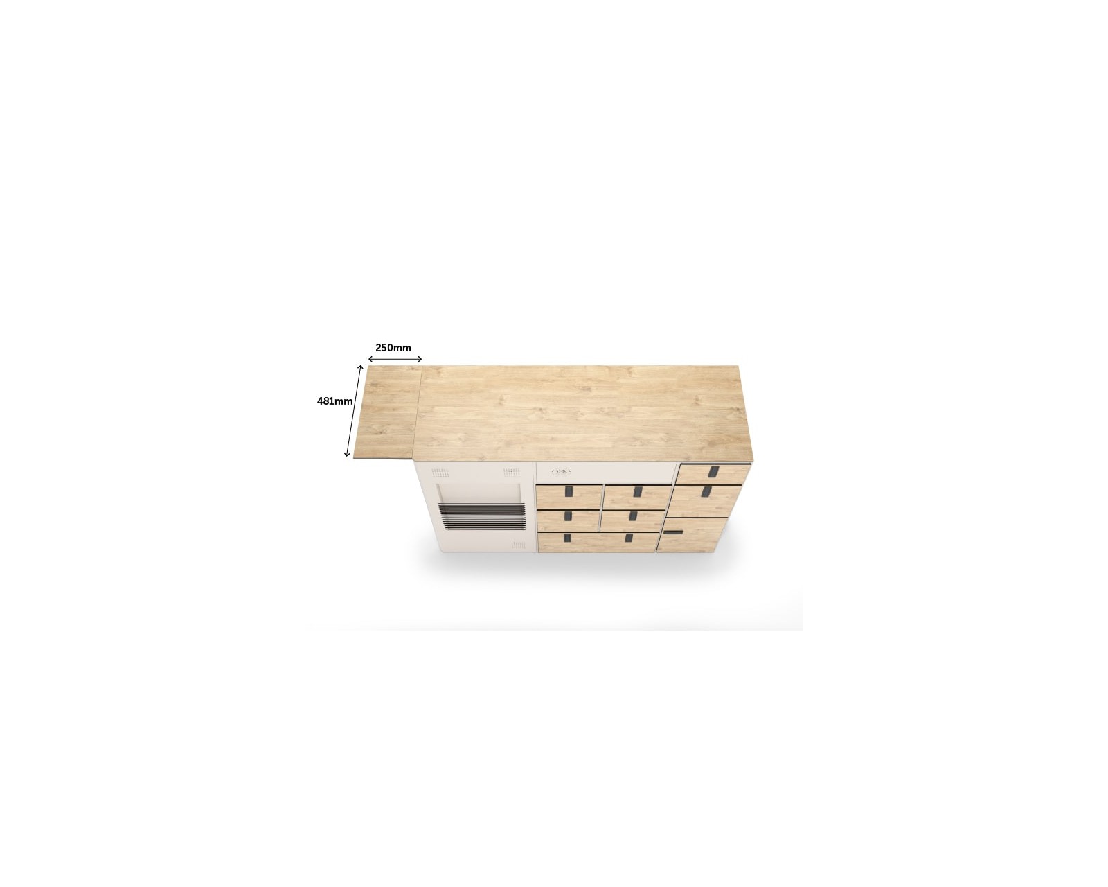 Die Arbeitsplatte ist aus 6 mm hochwertigem HPL mit matter Holzoptik gefertigt und passt perfekt zu Ihren Küchenfronten und dem Tisch. CNC-präziser Schnitt sorgt für saubere Kanten und ein abgeschrägtes Eingangsdesign schützt vor versehentlichen Prellungen. Dieses Material bewältigt Feuchtigkeit, Hitze und tägliche Küchenaufgaben kompromisslos. Die Arbeitsplatte ist mit 24 vorinstallierten Gewindeeinsätzen für eine sichere und präzise Montage an Ihrer Model 1 Basis ausgestattet.