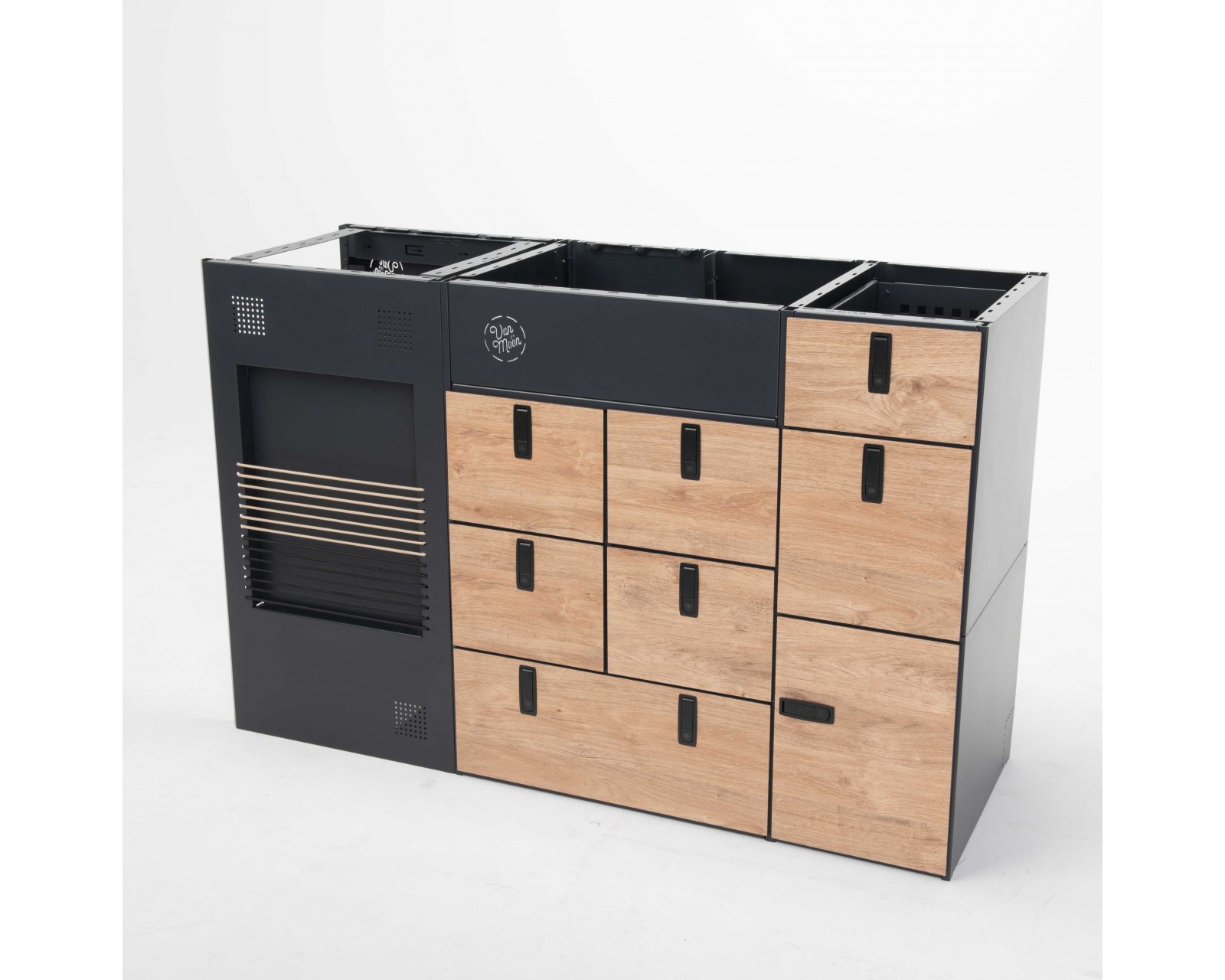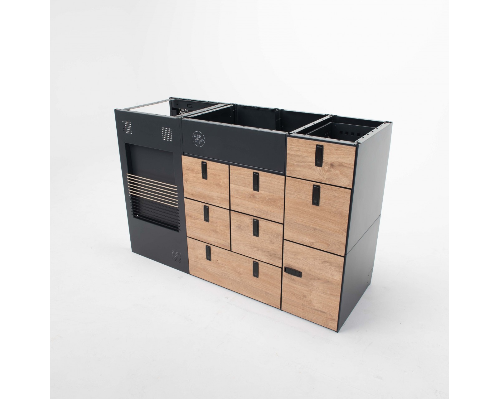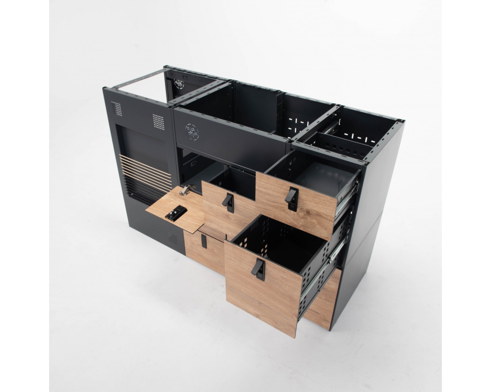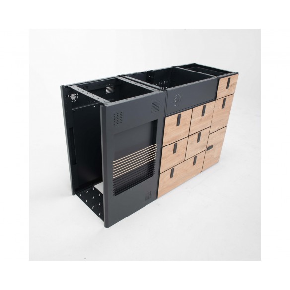 Please note: the fronts do not align perfectly. Sold without a countertop and without the table at the back.