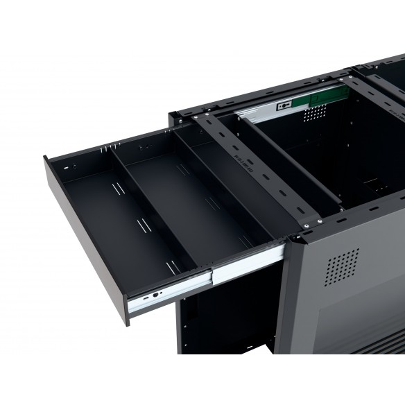 Inteligentne szuflady z przekładkami - aluminiowe przekładki dzielą każdą szufladę na regulowane przestrzenie dla idealnej organizacji.