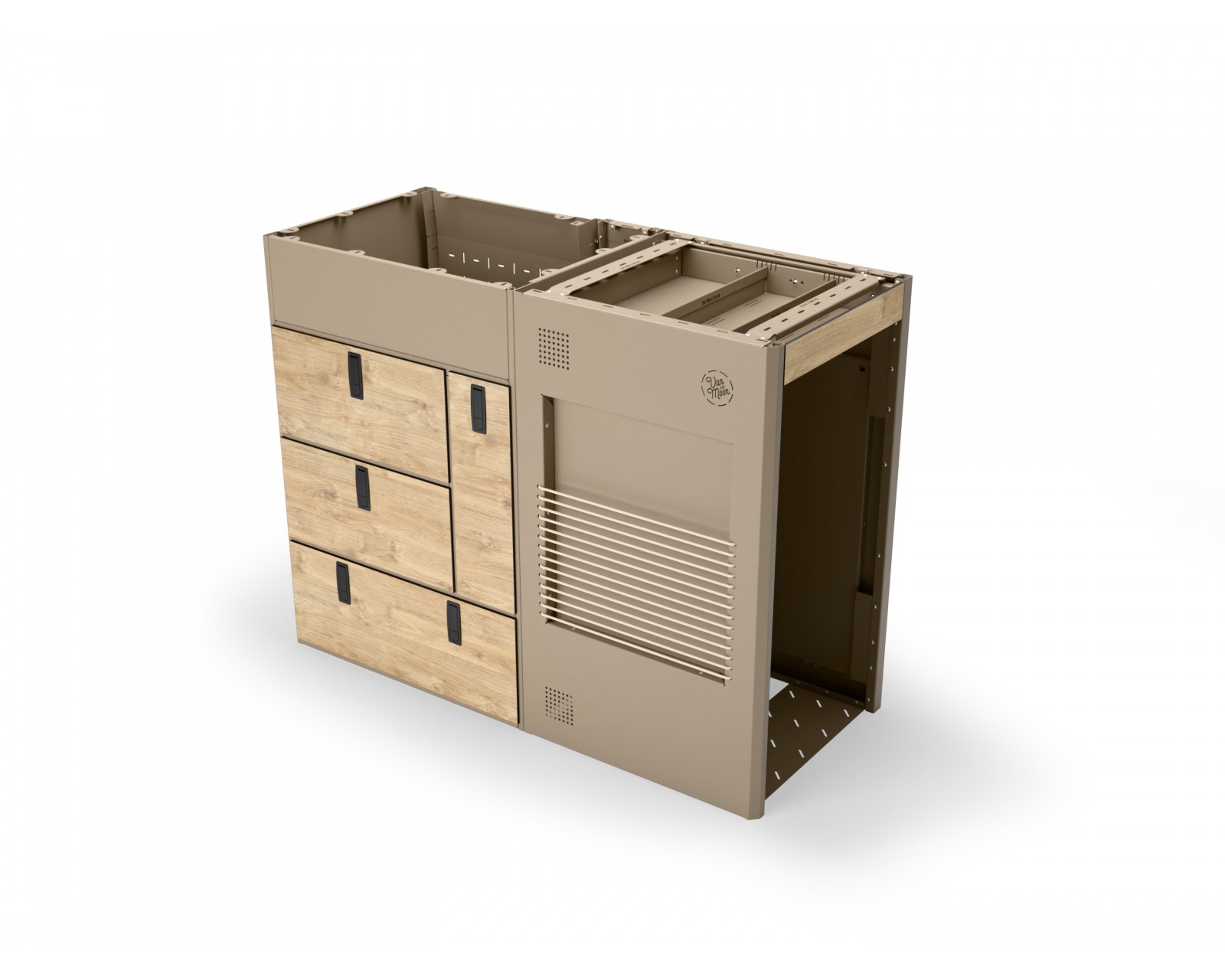 Skręcana konstrukcja aluminiowa, regulowane tylne ściany oraz 5 niezależnych modułów, pozwolą Ci zbudować ekskluzywną kuchnię do vana.