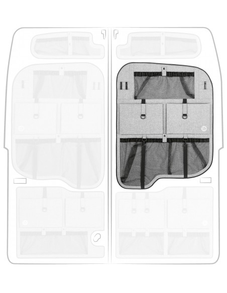 Moon Organizer powstał aby maksymalnie wykorzystać miejsce w Twoim vanie. Zamontowany na tylnych drzwiach zapewnia dostęp do podręcznych narzędzi. Mnogość kieszonek, siatek, haczyków i gumek sprawia, że wszystko zawsze jest pod ręką (i na swoim miejscu). Komplet organizerów pozwoli Ci przewieźć ponad 60 litrów bagażu bez straty przestrzeni wewnątrz auta.