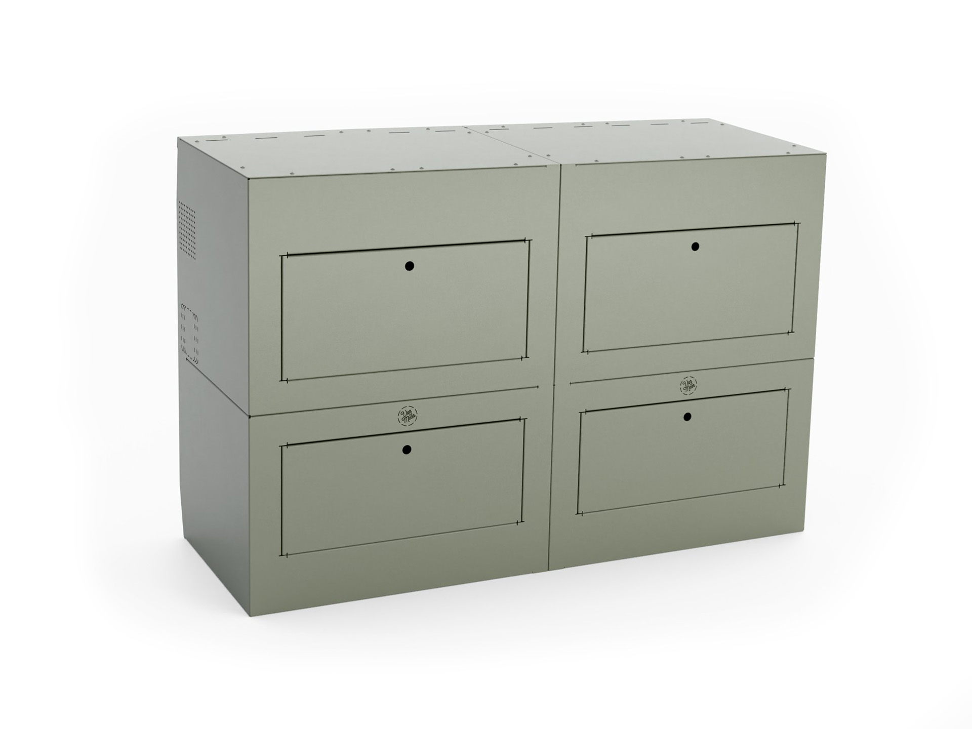 Mebel garażowy z systemem wentylacji przygotowany do montażu elektroniki, baterii, power station, różnych systemów ogrzewania (powietrze-powietrze, powietrze-woda). Do zamontowania po prawej lub po lewej stronie samochodu. Wyposażony w 4 perforowane płyty montażowe do montażu elektroniki, podwieszania przewodów, z kanałami elektrycznymi i uchwytami do montażu pasów transportowych, czterema demontowanymi półkami.